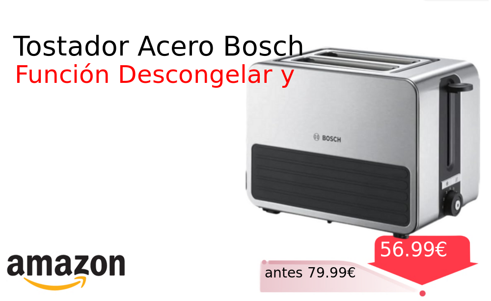 Buen Precio✨ Tostador Acero Bosch❗️🆕 #Amazon 🇪🇸 📛Precio Ya 56.99€❗️ (PVP: +79.99€) ✨Tostador Bosch con función descongelación y calentamiento Dos ranuras anchas en acero duradero para un dorado perfecto y uniforme cada mañana. cholloya.com/BOSCH_TAT7S25