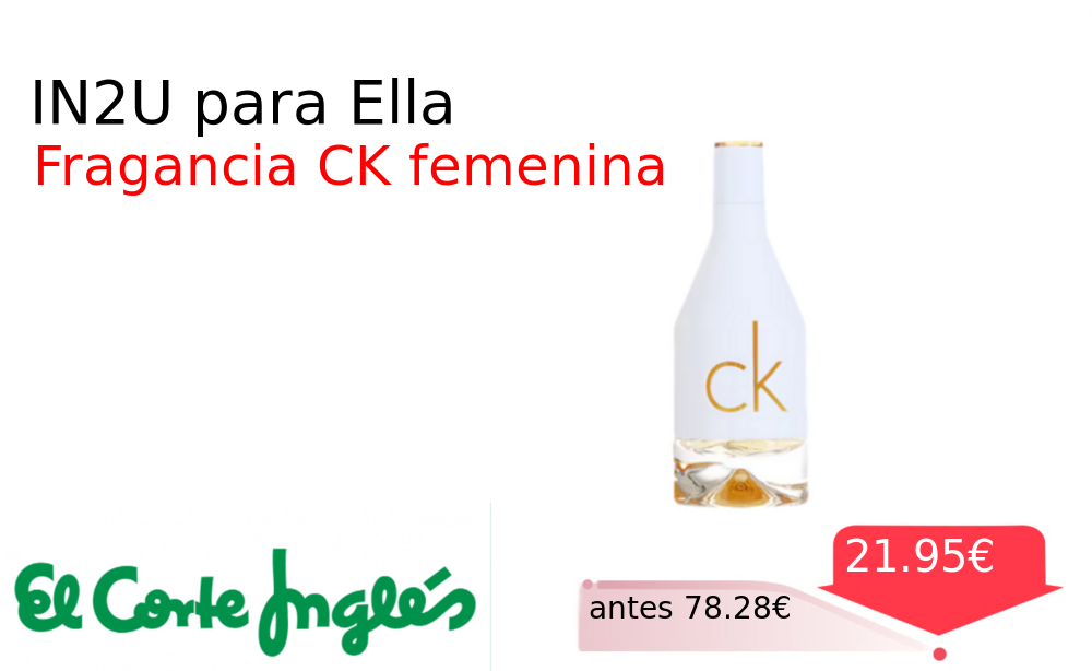 Mitad de precio✂️ IN2U para Ella❗️🆕 #Elcorteingles 📛Precio Ya 21.95€❗️ (PVP: +78.28€) ✨Fragancia fresca y moderna para mujer con notas vibrantes de cítricos y una base sensual Ideal para el día a día proyectando una actitud. cholloya.com/CK_IN2U_WOMEN