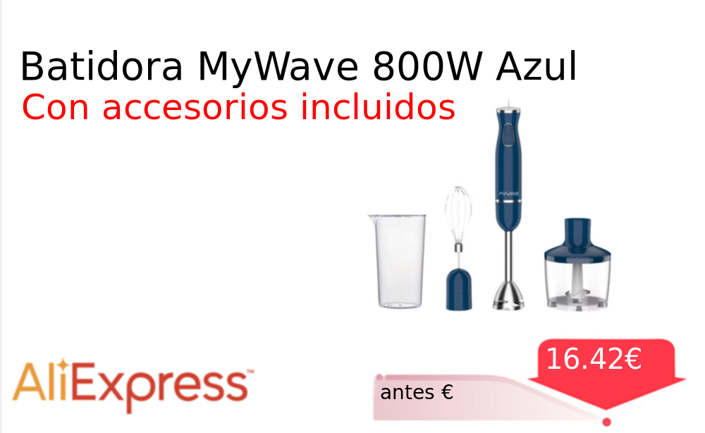 Buen Precio✨ Batidora MyWave 800W Azul❗️🆕 #AliExpress 📛Precio Ya 16.42€❗️ (PVP: +€) ✨Batidora de mano de 800W de potencia color azul Incluye varios accesorios prácticos para facilitar la preparación de tus recetas favoritas en la cocina. cholloya.com/MYWAVE_BATIDORA