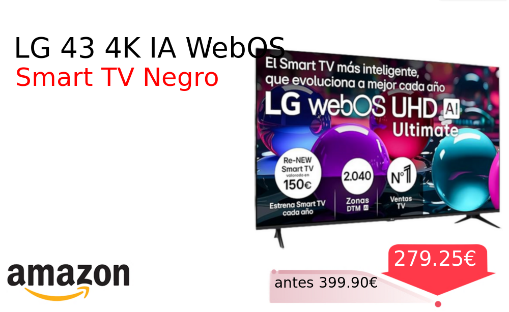 Más de un 30% 🚀 LG 43 4K IA WebOS❗️🆕 #Amazon 🇪🇸 📛Precio Ya 279.25€❗️ (PVP: +399.90€) ✨Televisor UHD 4K con procesador de IA para imágenes nítidas y colores vibrantes Sistema operativo WebOS y compatibilidad con asistentes de voz. cholloya.com/LG_43UA73006LA