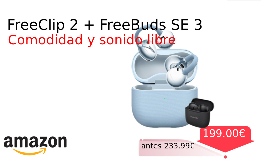Buen Precio✨ FreeClip 2 + FreeBuds SE 3❗️🆕 #Amazon 🇪🇸 📛Precio Ya 199.00€❗️ (PVP: +233.99€) ✨Auriculares abiertos inalámbricos con comodidad para todo el día Escucha adaptativa y hasta treinta y ocho horas de autonomía total Compatibles con iOS. cholloya.com/HUAWEI_FREECLIP