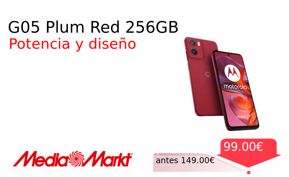 Más de un 30% 🚀 G05 Plum Red 256GB❗️🆕 #MediaMarkt 📛Precio Ya 99.00€❗️ (PVP: +149.00€) ✨Motorola G05 Plum Red con pantalla HD de 6 67 pulgadas cámara IA de 50 MP sonido Dolby Atmos y batería de larga duración. cholloya.com/MOTOROLA_G05