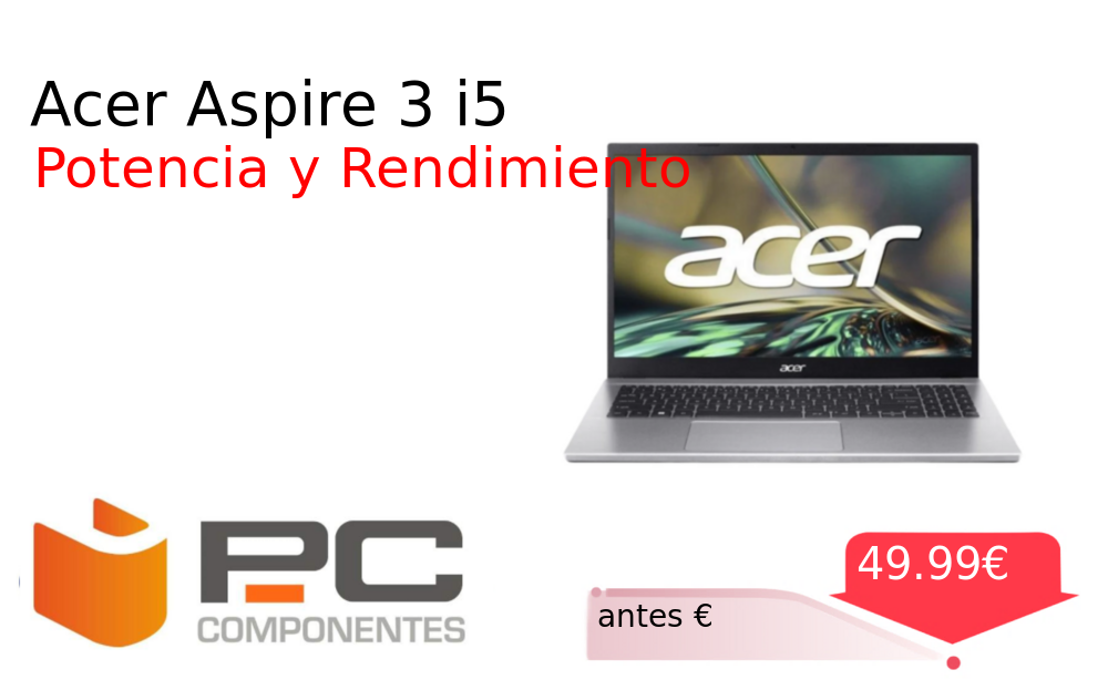 Buen Precio✨ Acer Aspire 3 i5❗️🆕 #PcComponentes 📛Precio Ya 49.99€❗️ (PVP: +€) ✨Equipo portátil con procesador Intel Core i5 memoria RAM de 16GB y almacenamiento SSD de 512GB Pantalla de 15 6 pulgadas para máxima productividad. cholloya.com/ACER_ASPIRE_3_I