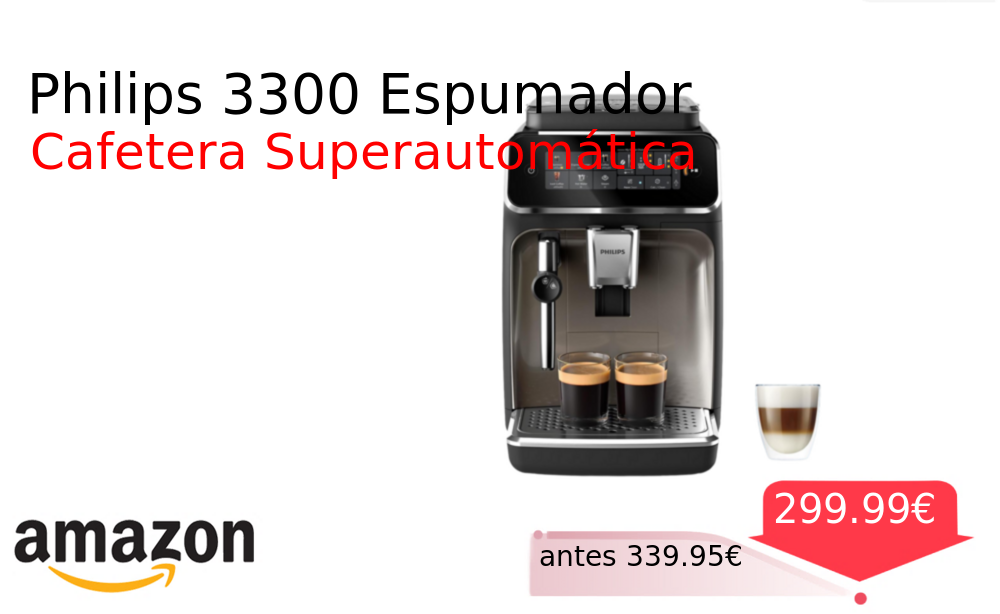 Buen Precio✨ Philips 3300 Espumador❗️🆕 #Amazon 🇪🇸 📛Precio Ya 299.99€❗️ (PVP: +339.95€) ✨Cafetera superautomática con espumador clásico cinco preparaciones distintas tecnología silenciosa y molinillo cerámico integrado para máxima calidad con diseno innovador y funcional. cholloya.com/PHILIPS_EP3326_