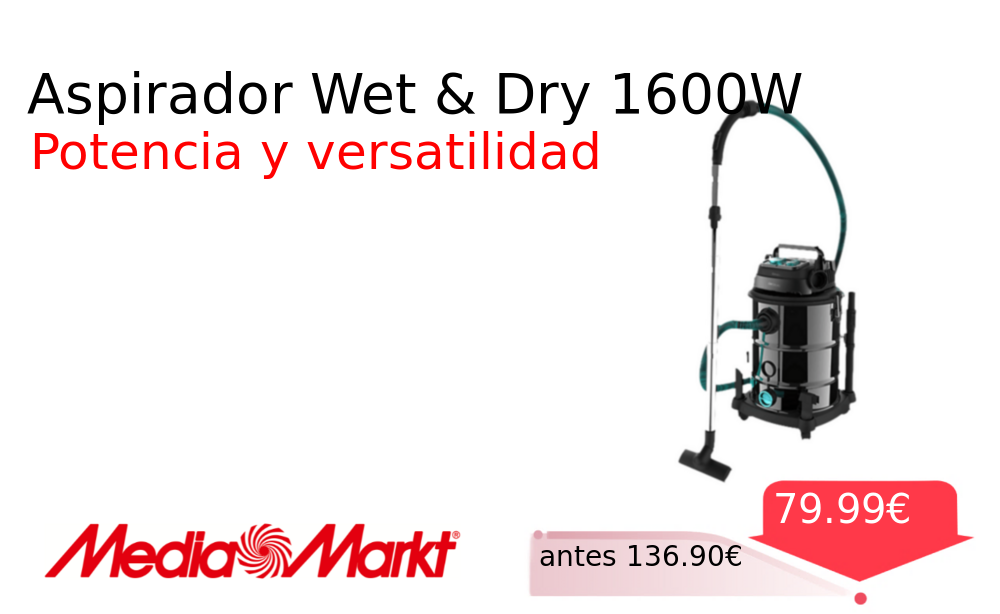 40% 📉 Vaya descuentazo‼‼ Aspirador Wet & Dry 1600W❗️🆕 #MediaMarkt 📛Precio Ya 79.99€❗️ (PVP: +136.90€) ✨Aspirador ultrapotente para sólidos y líquidos Succión profunda de 1600 W para una limpieza extrema y eficaz en todo tipo de superficies sin esfuerzo. cholloya.com/CECOTEC_CONGA_R