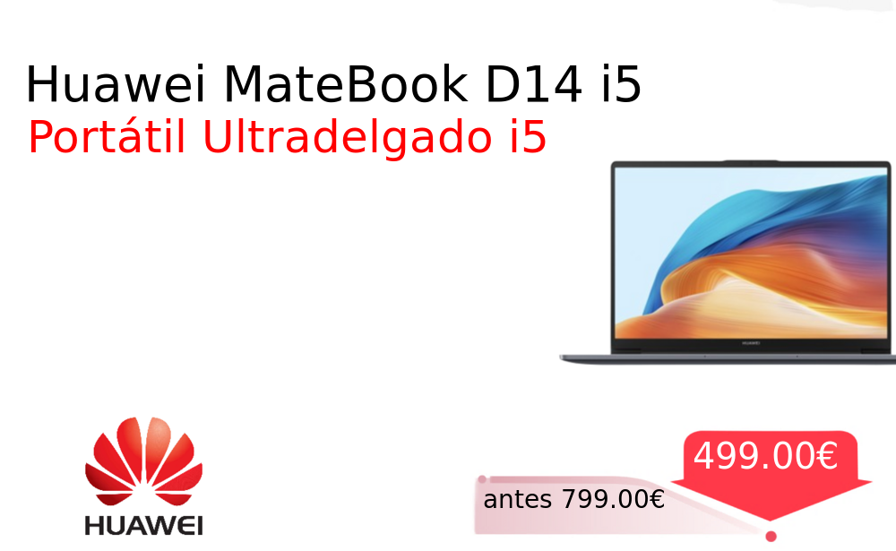 ¡¡Ojo a la ganga!! 📛 Huawei MateBook D14 i5❗️🆕 #Huawei 📛Precio Ya 499.00€❗️ (PVP: +799.00€) ✨Portátil Huawei con procesador Intel i5 diseño ultradelgado y rendimiento excepcional para trabajo y entretenimiento diario con diseno innovador y funcional. cholloya.com/HUAWEI_MATEBOOK