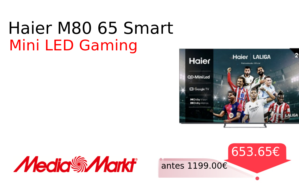 Cuponazo🏷️ Haier M80 65 Smart❗️🆕 #MediaMarkt 📛Precio Ya 653.65€❗️ (PVP: +1199.00€) ✨Televisor con tecnología QD-Mini LED y resolución 4K UHD Diseño moderno sistema Google TV sonido premium Dolby Atmos y frecuencia 120Hz para gaming. cholloya.com/HAIER_M80_65
