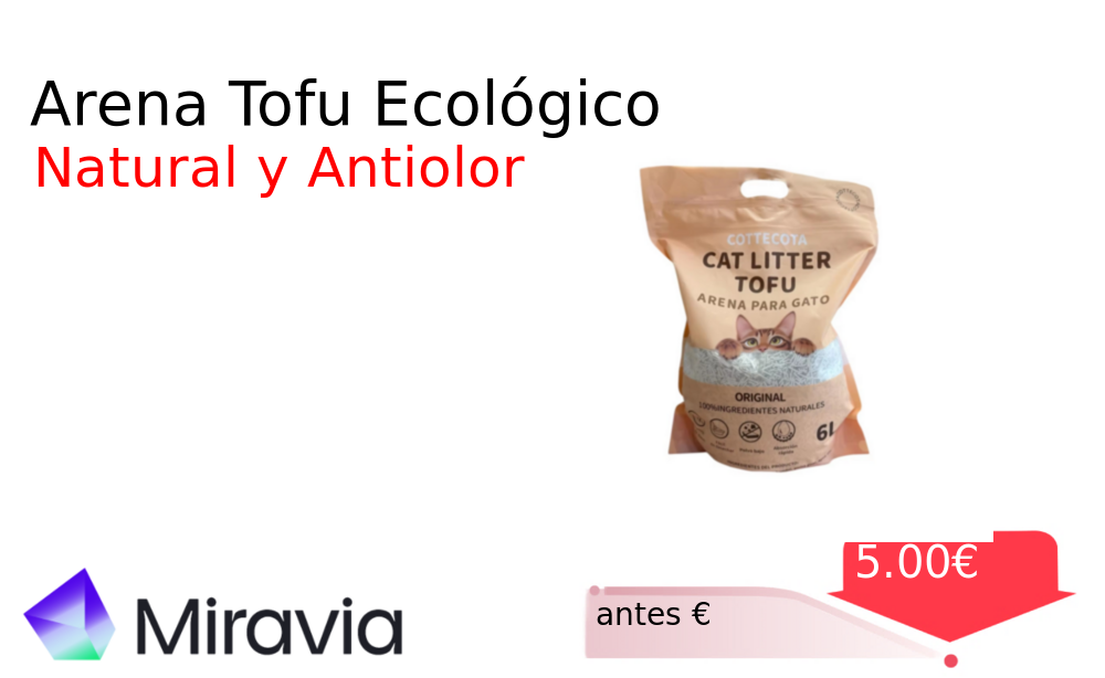 Buen Precio✨ Arena Tofu Ecológico❗️🆕 #Miravia 📛Precio Ya 5.00€❗️ (PVP: +€) ✨Arena vegetal ecológica de tofu para gatos Libre de polvo aglomerante natural y altamente absorbente Controla olores eficazmente con materiales sostenibles y seguros. cholloya.com/COTTECOTA_TOFU
