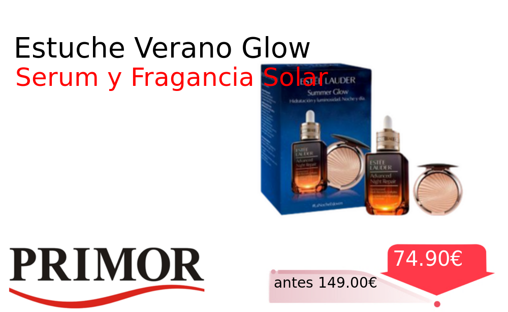 40% 📉 Vaya descuentazo‼‼ Estuche Verano Glow❗️🆕 #Primor 📛Precio Ya 74.90€❗️ (PVP: +149.00€) ✨Serum reparador nocturno y fragancia solar en un estuche especial Hidratación intensa y un aroma a verano que perdura todo el día. cholloya.com/ESTEE_LAUDER_GL