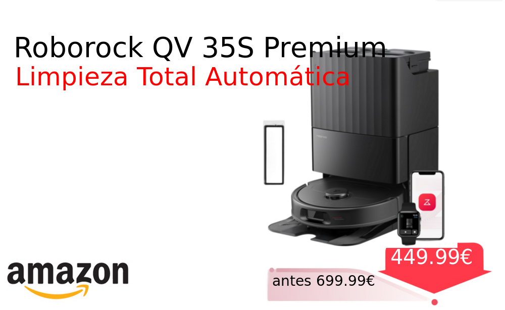 Más de un 30% 🚀 Roborock QV 35S Premium❗️🆕 #Amazon 🇪🇸 📛Precio Ya 449.99€❗️ (PVP: +699.99€) ✨Robot aspirador con base multifuncional y succión HyperForce de 10000 Pa Incluye cepillos antienredos mopas giratorias y elevación automática para limpieza completa. cholloya.com/ROBOROCK_QV35S_