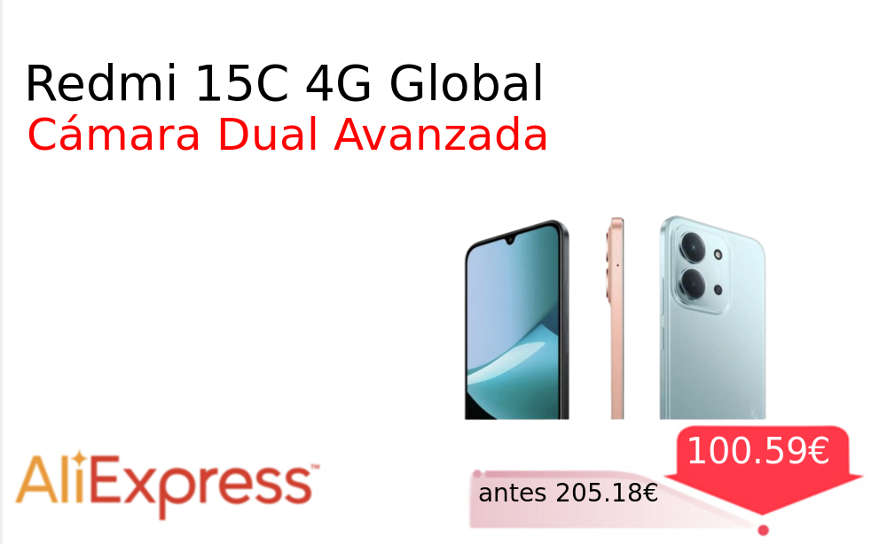 Mitad de precio✂️ Redmi 15C 4G Global❗️🆕 #AliExpress 📛Precio Ya 100.59€❗️ (PVP: +205.18€) ✨Teléfono móvil con cámara AI dual de 50MP y batería de larga duración Incluye carga rápida avanzada y diseño premium para uso diario intensivo. cholloya.com/REDMI_15C_4G
