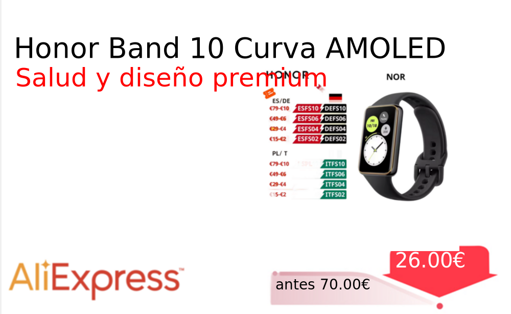 Mitad de precio✂️ Honor Band 10 Curva AMOLED❗️🆕 #AliExpress 📛Precio Ya 26.00€❗️ (PVP: +70.00€) ✨Pulsera inteligente con pantalla AMOLED curva de 1 57 pulgadas Resistente al agua 5ATM y conectividad Bluetooth5 3 para monitorización continua de tu salud. cholloya.com/HONOR_BAND_10