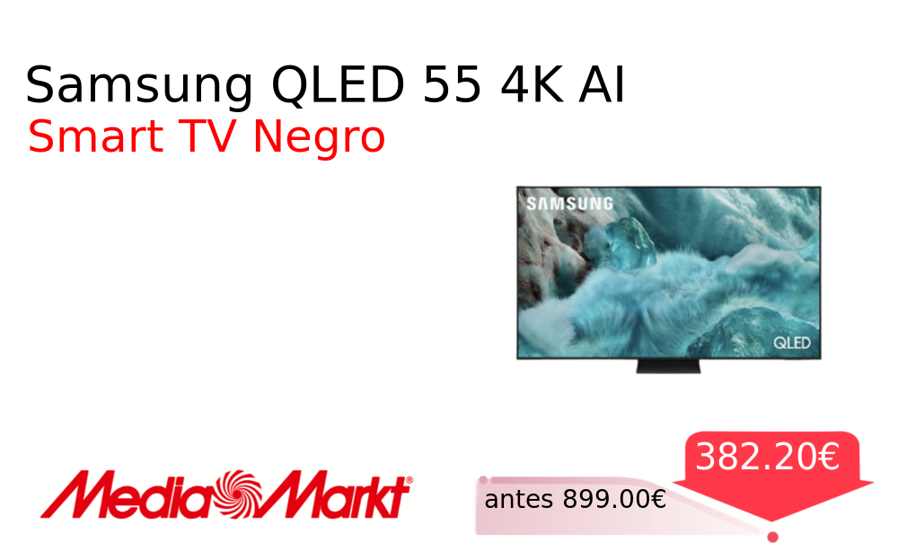 40% 📉 Vaya descuentazo‼‼ Samsung QLED 55 4K AI❗️🆕 #MediaMarkt 📛Precio Ya 382.20€❗️ (PVP: +899.00€) ✨Televisor QLED 55 Samsung con procesador Q4 AI resolución 4K y tecnología Smart TV Imagen nítida y sonido envolvente para disfrutar del mejor entretenimiento. cholloya.com/TV_QLED_SAMSUNG