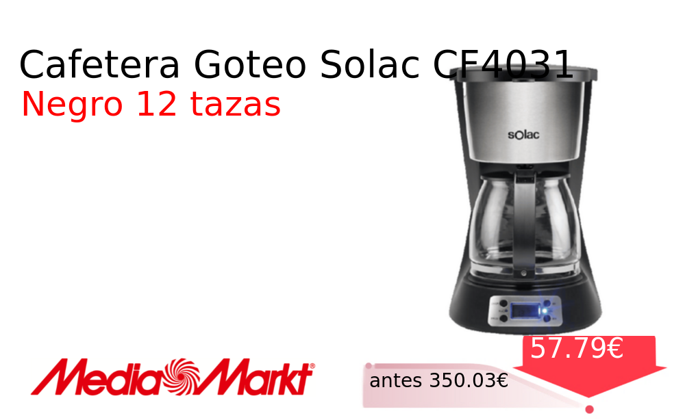 Mitad de precio✂️ Cafetera Goteo Solac CF4031❗️🆕 #MediaMarkt 📛Precio Ya 57.79€❗️ (PVP: +350.03€) ✨Cafetera de goteo Solac con capacidad para 12 tazas Filtro extraíble y potencia de 1000 W Producto reacondicionado con garantía completa y funcionamiento óptimo. cholloya.com/SOLAC_CF4031