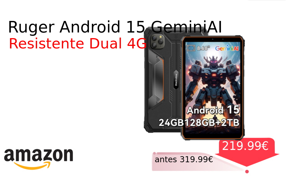 Más de un 30% 🚀 Ruger Android 15 GeminiAI❗️🆕 #Amazon 🇪🇸 📛Precio Ya 219.99€❗️ (PVP: +319.99€) ✨Tableta robusta Android con pantalla IPS de alta frecuencia IA avanzada conectividad dual y amplio almacenamiento expandible para máxima productividad móvil. cholloya.com/TABLET_RUGER_5G