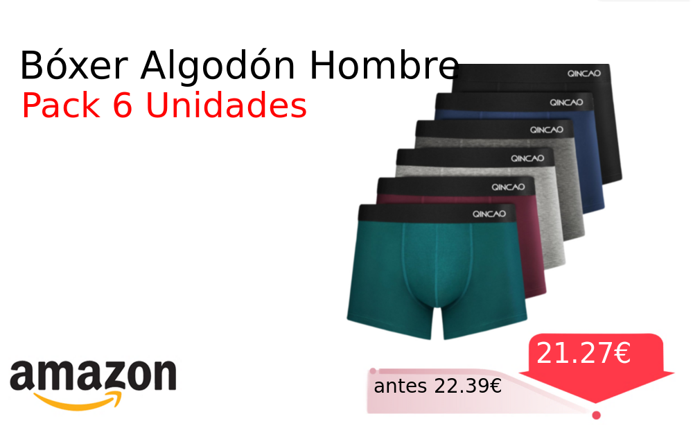 Buen Precio✨ Bóxer Algodón Hombre❗️🆕 #Amazon 🇪🇸 📛Precio Ya 21.27€❗️ (PVP: +22.39€) ✨Calzoncillos bóxer de algodón suave que no irritan la piel Pack de seis unidades con tallas desde la S hasta la 4XL Comodidad duradera. cholloya.com/QINCAO_BOXER_6