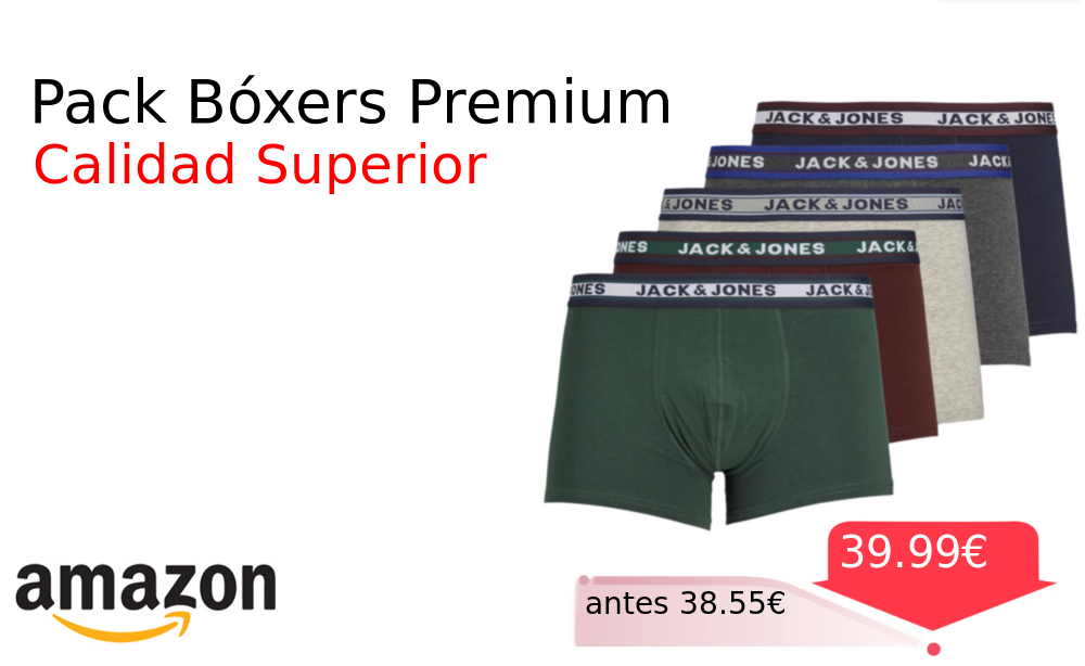 Buen Precio✨ Pack Bóxers Premium❗️🆕 #Amazon 🇪🇸 📛Precio Ya 39.99€❗️ (PVP: +38.55€) ✨Cinco bóxers de excelente calidad confeccionados con materiales premium para máxima comodidad durante todo el día Diseño moderno y resistente. cholloya.com/JACKJONES_TRUNK