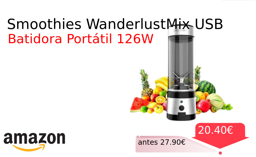 Buen Precio✨ Smoothies WanderlustMix USB❗️🆕 #Amazon 🇪🇸 📛Precio Ya 20.40€❗️ (PVP: +27.90€) ✨Batidora de vaso compacta y portátil con 126W de potencia Vaso de 400ml y cuchillas de titanio para smoothies perfectos Carga USB y autonomía. cholloya.com/CECOTEC_WANDERL