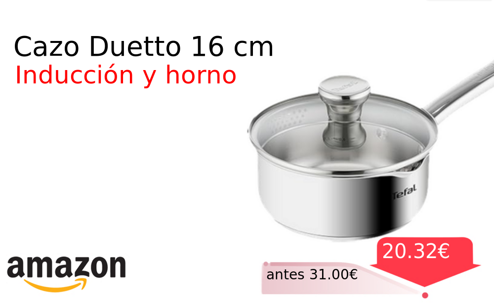 Más de un 30% 🚀 Cazo Duetto 16 cm❗️🆕 #Amazon 🇪🇸 📛Precio Ya 20.32€❗️ (PVP: +31.00€) ✨Cazo de acero inoxidable con base Thermo-Fusion para inducción Incluye marcas de medición es apto para lavavajillas y resistente al horno por su calidad. cholloya.com/TEFAL_DUETTO_16