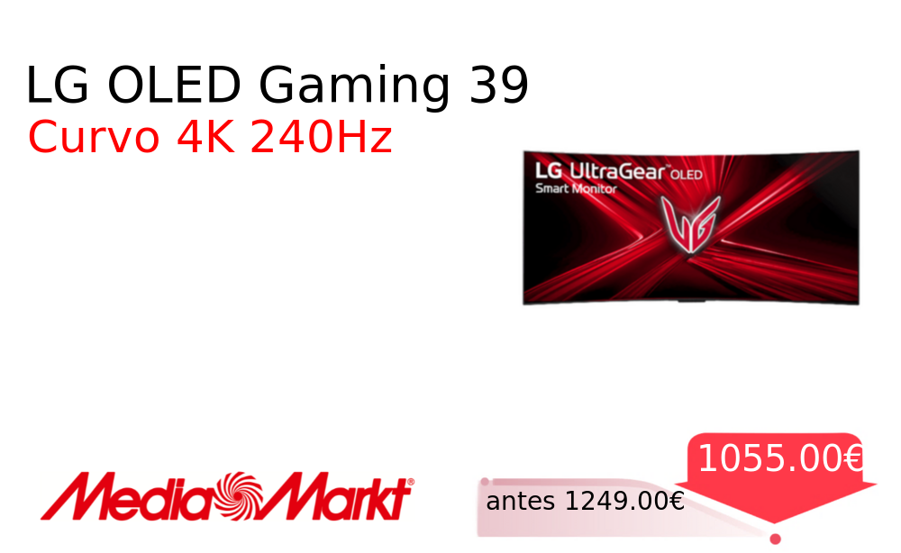 Buen Precio✨ LG OLED Gaming 39❗️🆕 #MediaMarkt 📛Precio Ya 1055.00€❗️ (PVP: +1249.00€) ✨Monitor gaming LG 39 OLED curvo con resolución 4K 240 Hz y 0 03 ms Incluye Smart TV webOS altavoces integrados y altura ajustable. cholloya.com/LG_39GX90SA_W