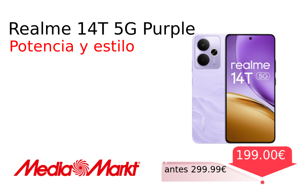 Más de un 30% 🚀 Realme 14T 5G Purple❗️🆕 #MediaMarkt 📛Precio Ya 199.00€❗️ (PVP: +299.99€) ✨Smartphone 5G con pantalla AMOLED de 120 Hz procesador Dimensity y batería de larga duración Cámara avanzada y amplio almacenamiento. cholloya.com/REALME_14T_5G