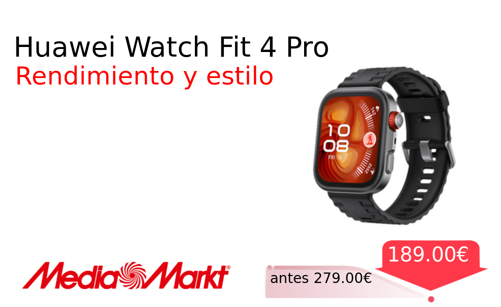 Más de un 30% 🚀 Huawei Watch Fit 4 Pro❗️🆕 #MediaMarkt 📛Precio Ya 189.00€❗️ (PVP: +279.00€) ✨Smartwatch elegante con pantalla AMOLED de 1 82 pulgadas autonomía extendida y compatibilidad total con iOS y Android correa confortable. cholloya.com/HUAWEI_WATCH_FI