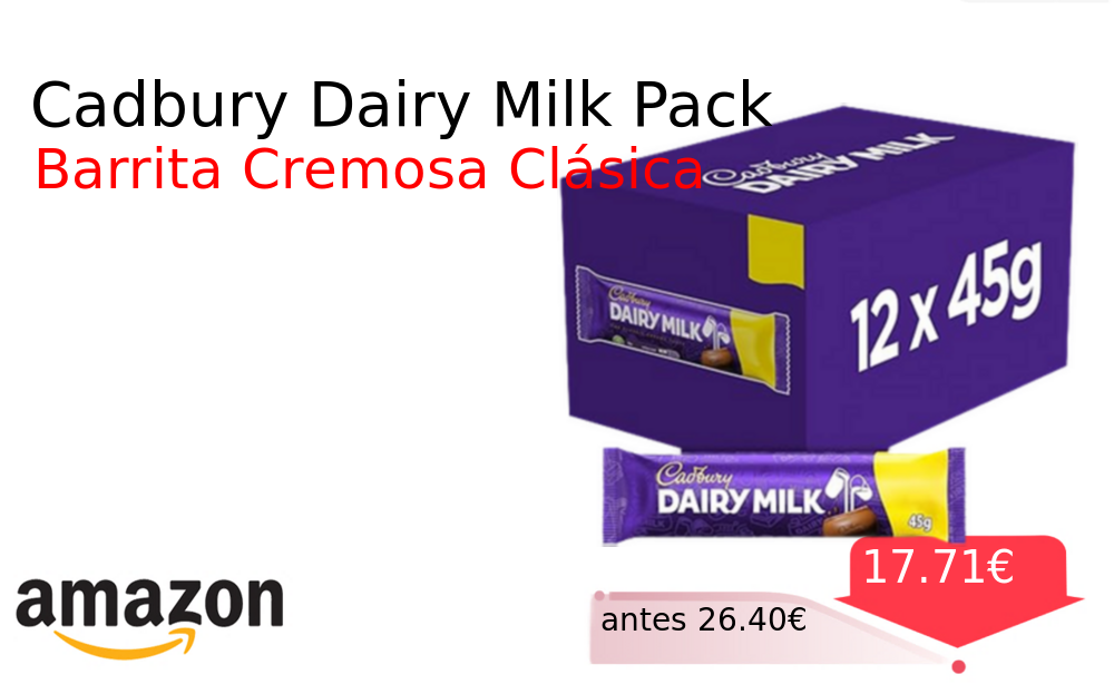 Más de un 30% 🚀 Cadbury Dairy Milk Pack❗️🆕 #Amazon 🇪🇸 📛Precio Ya 17.71€❗️ (PVP: +26.40€) ✨La barrita de chocolate con leche clásica con un sabor cremoso e inconfundible Perfecta para compartir o disfrutar de un capricho delicioso en cualquier. cholloya.com/CADBURY_PACK_12