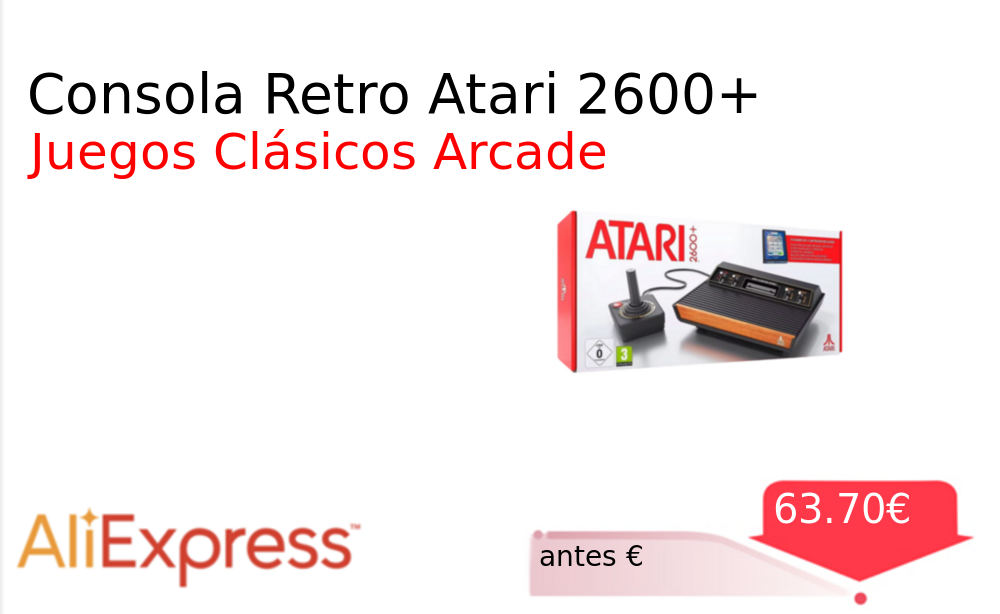 Buen Precio✨ Consola Retro Atari 2600+❗️🆕 #AliExpress 📛Precio Ya 63.70€❗️ (PVP: +€) ✨Revive la magia de los clásicos arcade con esta consola retro Incluye controles auténticos y es compatible con tus cartuchos originales para una experiencia. cholloya.com/ATARI_2600_PLUS