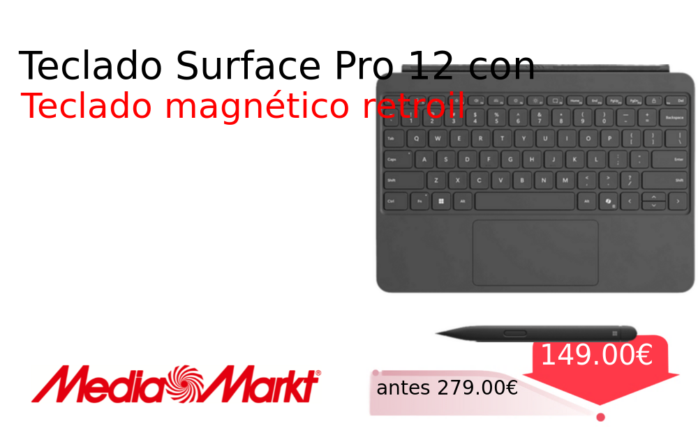40% 📉 Vaya descuentazo‼‼ Teclado Surface Pro 12 con❗️🆕 #MediaMarkt 📛Precio Ya 149.00€❗️ (PVP: +279.00€) ✨Teclado magnético retroiluminado para Surface Pro 12 incluye lápiz digital Diseño fino y cómodo con teclas especiales para una experiencia de escritura mejorada. cholloya.com/MICROSOFT_SURFA