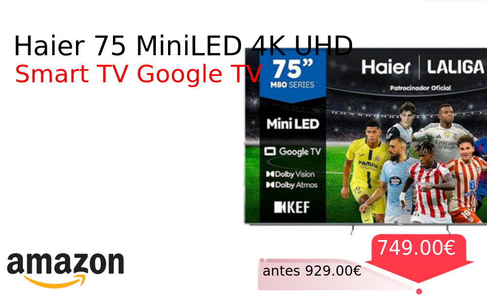 Buen Precio✨ Haier 75 MiniLED 4K UHD❗️🆕 #Amazon 🇪🇸 📛Precio Ya 749.00€❗️ (PVP: +929.00€) ✨Televisor de 75 pulgadas con tecnología MiniLED 4K UHD Smart TV con Google TV sonido Dolby Atmos y visión Dolby Vision Procesador Quad Core. cholloya.com/HAIER_H75M80FUX