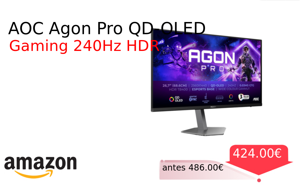 Buen Precio✨ AOC Agon Pro QD-OLED❗️🆕 #Amazon 🇪🇸 📛Precio Ya 424.00€❗️ (PVP: +486.00€) ✨Monitor gaming 27 QHD con panel QD-OLED tasa de refresco 240Hz y tiempo de respuesta ultrarrápido Tecnología HDR400 TrueBlack y compatibilidad G-Sync para una. cholloya.com/AOC_AGON_PRO_QD
