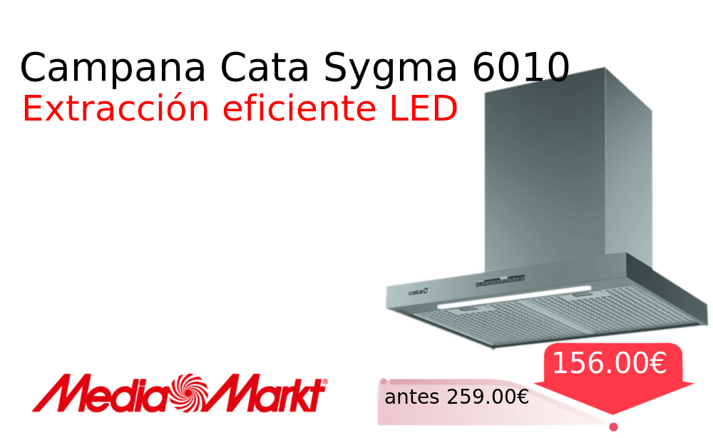 Más de un 30% 🚀 Campana Cata Sygma 6010❗️🆕 #MediaMarkt 📛Precio Ya 156.00€❗️ (PVP: +259.00€) ✨Campana decorativa Cata con 4 niveles de potencia extracción de 802 m³ h y luz LED integrada Elimina humos eficazmente manteniendo tu cocina limpia. cholloya.com/CATA_SYGMA_6010