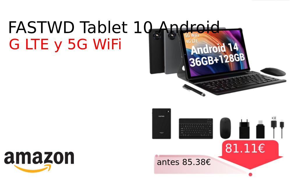 Buen Precio✨ FASTWD Tablet 10 Android❗️🆕 #Amazon 🇪🇸 📛Precio Ya 81.11€❗️ (PVP: +85.38€) ✨Tableta Android 14 con conectividad 4G LTE y 5G WiFi Pantalla FHD de 10 pulgadas 36GB RAM y 128GB almacenamiento Batería de larga duración. cholloya.com/FASTWD_TABLET_1