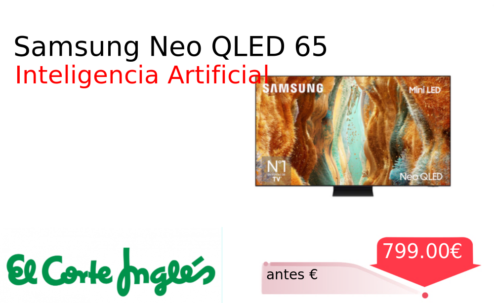 Buen Precio✨ Samsung Neo QLED 65❗️🆕 #Elcorteingles 📛Precio Ya 799.00€❗️ (PVP: +€) ✨Televisor Samsung con tecnología Neo QLED Mini LED de 65 pulgadas y resolución 4K El procesador con IA mejora automáticamente el contenido para una. cholloya.com/TV_SAMSUNG_65