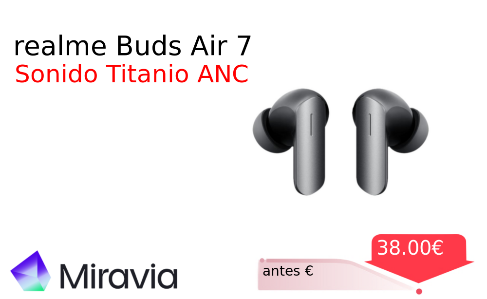 Buen Precio✨ realme Buds Air 7❗️🆕 #Miravia 📛Precio Ya 38.00€❗️ (PVP: +€) ✨Auriculares con driver de titanio de 12 4 mm y cancelación activa de ruido Audio Hi-Res sonido espacial y autonomía prolongada para una experiencia. cholloya.com/REALME_BUDS_AIR