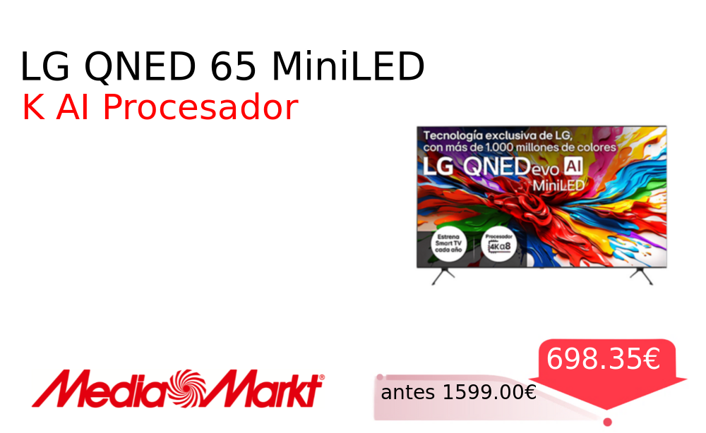 Mitad de precio✂️ LG QNED 65 MiniLED❗️🆕 #MediaMarkt 📛Precio Ya 698.35€❗️ (PVP: +1599.00€) ✨Televisor LG QNED de 65 pulgadas con tecnología MiniLED y resolución 4K UHD Procesador α8 AI Gen2 para colores vibrantes y experiencia visual inmersiva. cholloya.com/LG_QNED92A6A
