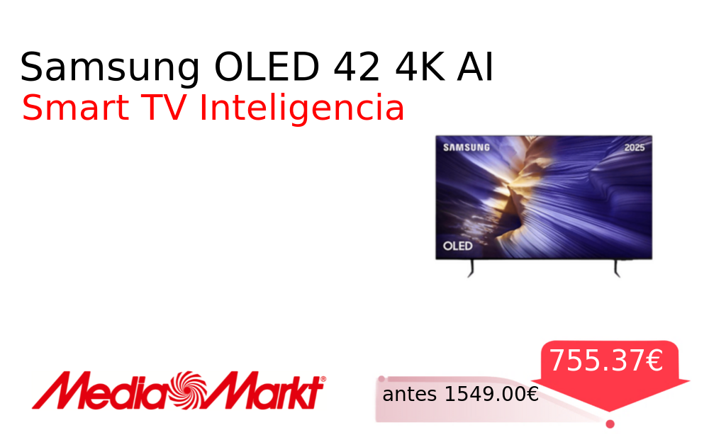 Mitad de precio✂️ Samsung OLED 42 4K AI❗️🆕 #MediaMarkt 📛Precio Ya 755.37€❗️ (PVP: +1549.00€) ✨Televisor OLED con resolución 4K y procesador NQ4 AI Gen3 Tecnología Smart TV con funciones avanzadas de inteligencia artificial completa. cholloya.com/TV_SAMSUNG_OLED
