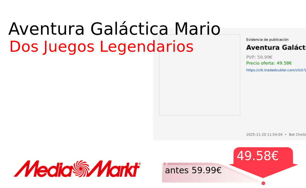 Buen Precio✨ Aventura Galáctica Mario❗️🆕 #MediaMarkt 📛Precio Ya 49.58€❗️ (PVP: +59.99€) ✨Recorre el cosmos con Mario en esta aventura galáctica Explora mundos fascinantes junto a Yoshi en la Astronave Mario con dos juegos legendarios. cholloya.com/NINTENDO_GALAXY