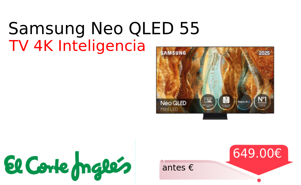 Buen Precio✨ Samsung Neo QLED 55❗️🆕 #Elcorteingles 📛Precio Ya 649.00€❗️ (PVP: +€) ✨Televisor Samsung con tecnología Neo QLED Mini LED de 139cm Resolución 4K y procesador con IA para mejorar contenido Experiencia visual inmersiva y colores. cholloya.com/TV_SAMSUNG_QN74