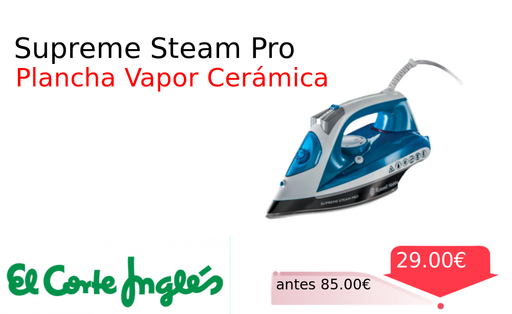 Mitad de precio✂️ Supreme Steam Pro❗️🆕 #Elcorteingles 📛Precio Ya 29.00€❗️ (PVP: +85.00€) ✨Plancha de vapor con suela cerámica que desliza suavemente Genera potente vapor continuo para eliminar arrugas fácilmente en todas las prendas. cholloya.com/RUSSELL_STEAM_P
