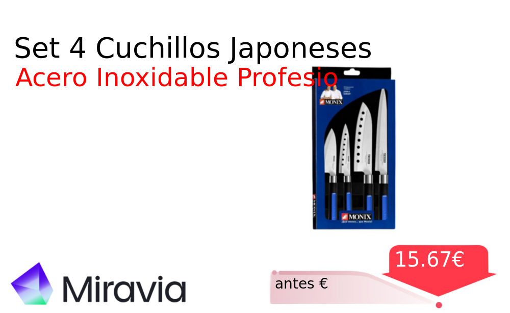 Buen Precio✨ Set 4 Cuchillos Japoneses❗️🆕 #Miravia 📛Precio Ya 15.67€❗️ (PVP: +€) ✨Set de cuatro cuchillos japoneses de acero inoxidable profesional Afilados y duraderos para un corte preciso en todas tus preparaciones culinarias diarias. cholloya.com/MONIX_SOLID_PLU