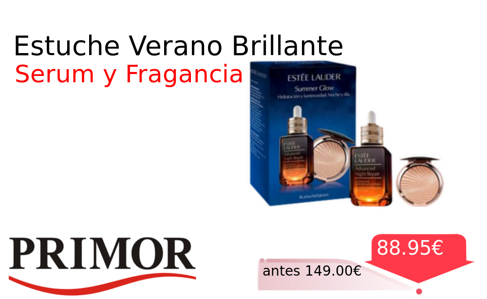 40% 📉 Vaya descuentazo‼‼ Estuche Verano Brillante❗️🆕 #Primor 📛Precio Ya 88.95€❗️ (PVP: +149.00€) ✨Serum reparador nocturno y perfume icónico en un estuche especial Logra un brillo saludable y una fragancia solar inolvidable para tu piel. cholloya.com/ESTEE_LAUDER_GL