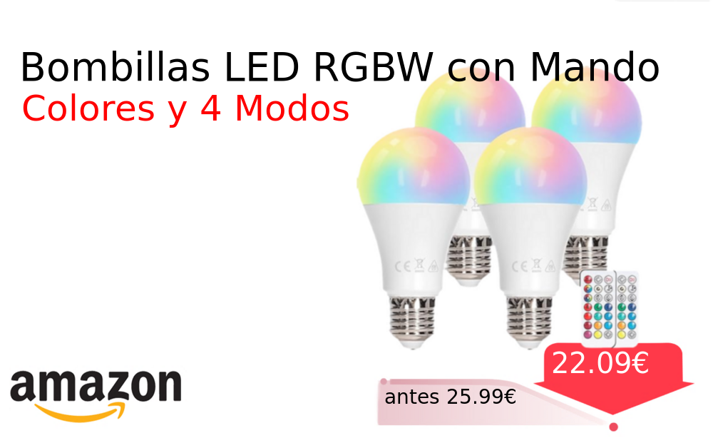 Buen Precio✨ Bombillas LED RGBW con Mando❗️🆕 #Amazon 🇪🇸 📛Precio Ya 22.09€❗️ (PVP: +25.99€) ✨Bombillas LED E27 con mando a distancia Ofrecen 15 colores 4 modos de iluminación y 5 niveles de brillo ajustables Perfectas para crear ambientes. cholloya.com/BOMBILLAS_RGBW_