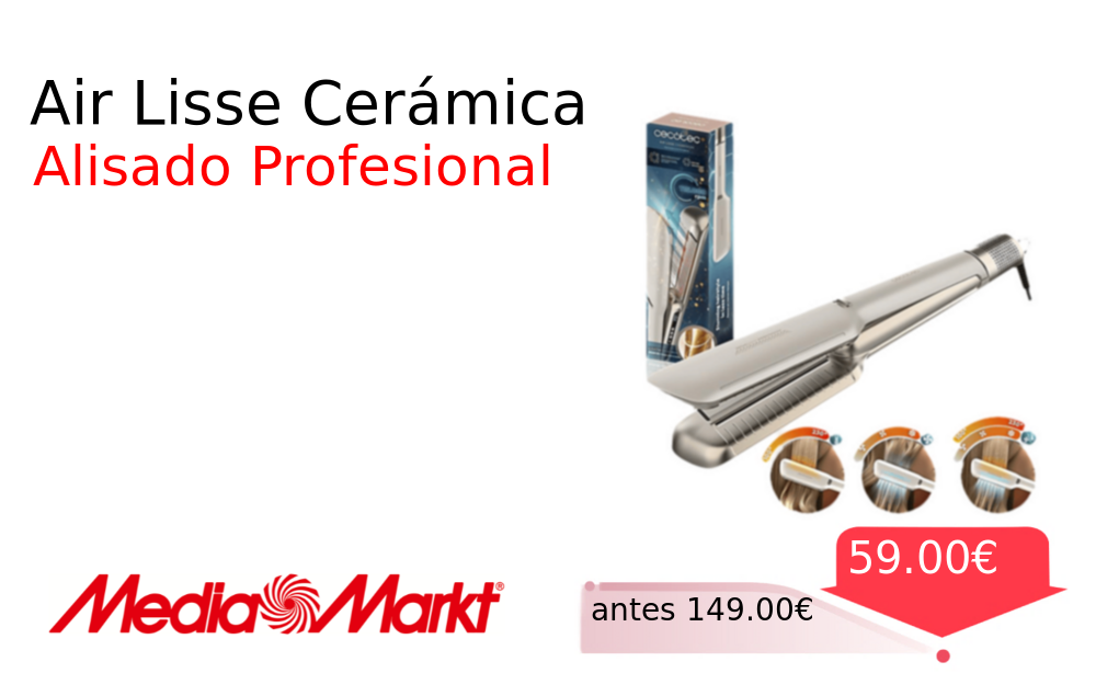 Mitad de precio✂️ Air Lisse Cerámica❗️🆕 #MediaMarkt 📛Precio Ya 59.00€❗️ (PVP: +149.00€) ✨Plancha con aire integrado y revestimiento cerámico Alisa rápido protege el cabello con keratina y aceite de argán para un brillo duradero y suave. cholloya.com/CECOTEC_AIRLISS