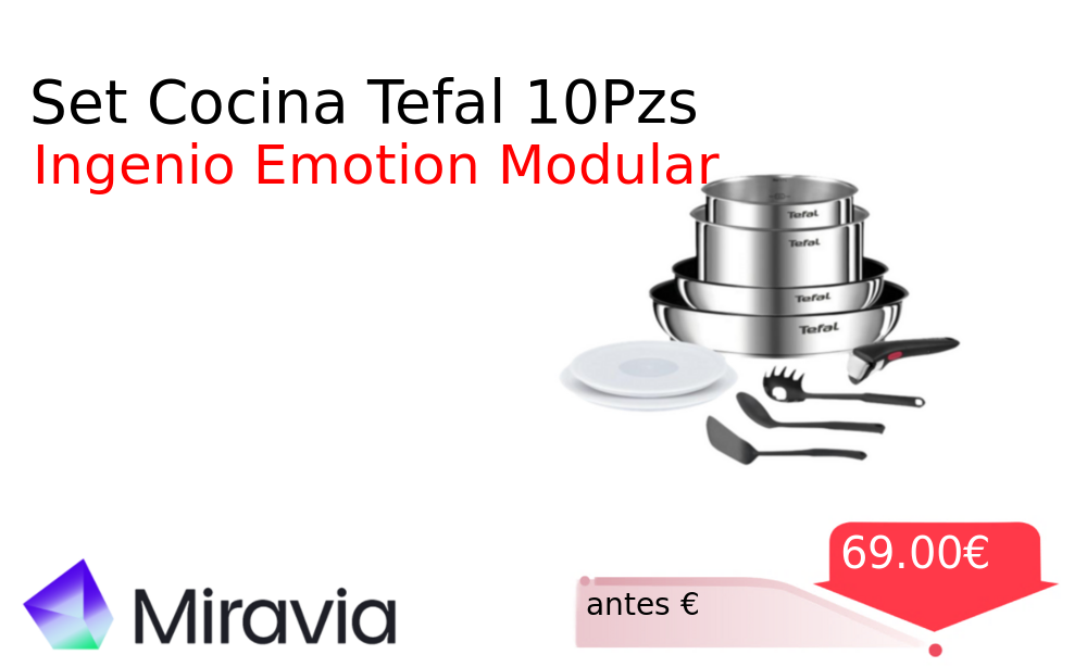 Buen Precio✨ Set Cocina Tefal 10Pzs❗️🆕 #Miravia 📛Precio Ya 69.00€❗️ (PVP: +€) ✨Set de 10 piezas Tefal Ingenio Emotion Diseño modular y ergonómico para una cocina eficiente Mango desmontable y apto para todo tipo de fuegos. cholloya.com/TEFAL_INGENIO_S