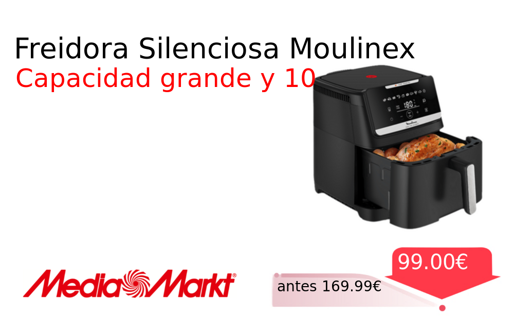 40% 📉 Vaya descuentazo‼‼ Freidora Silenciosa Moulinex❗️🆕 #MediaMarkt 📛Precio Ya 99.00€❗️ (PVP: +169.99€) ✨Freidora de aire silenciosa con capacidad para ocho personas Diez programas preestablecidos garantizan resultados crujientes y saludables con mínimo consumo energético. cholloya.com/MOULINEX_EASY_F