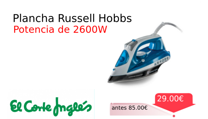 Mitad de precio✂️ Plancha Russell Hobbs❗️🆕 #Elcorteingles 📛Precio Ya 37.00€❗️ (PVP: +79.00€) ✨Selector de tacto suave. Asa de tacto suave. Planchado seco, con vapor, pulverización y chorro. cholloya.com/RUSSELLHOBBS206