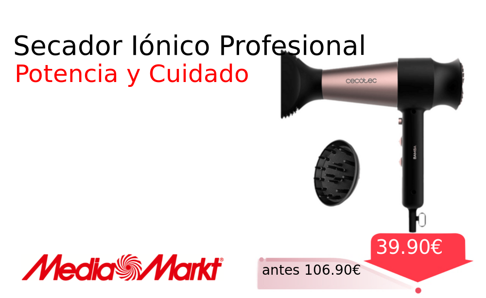 Mitad de precio✂️ Secador Iónico Profesional❗️🆕 #MediaMarkt 📛Precio Ya 39.90€❗️ (PVP: +106.90€) ✨Secador profesional con tecnología iónica para un cabello brillante y sin encrespamiento Motor digital silencioso de alta potencia y tres niveles de calor ajustables. cholloya.com/CECOTEC_BAMBA_I
