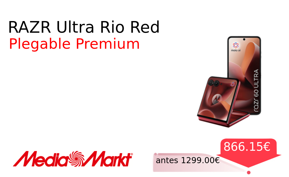 Más de un 30% 🚀 RAZR Ultra Rio Red❗️🆕 #MediaMarkt 📛Precio Ya 866.15€❗️ (PVP: +1299.00€) ✨Motorola RAZR 60 Ultra con pantalla AMOLED plegable de 7 pulgadas Potente Snapdragon 8 Elite y 512 GB de almacenamiento Ideal para crear contenido. cholloya.com/MOTOROLA_RAZR60