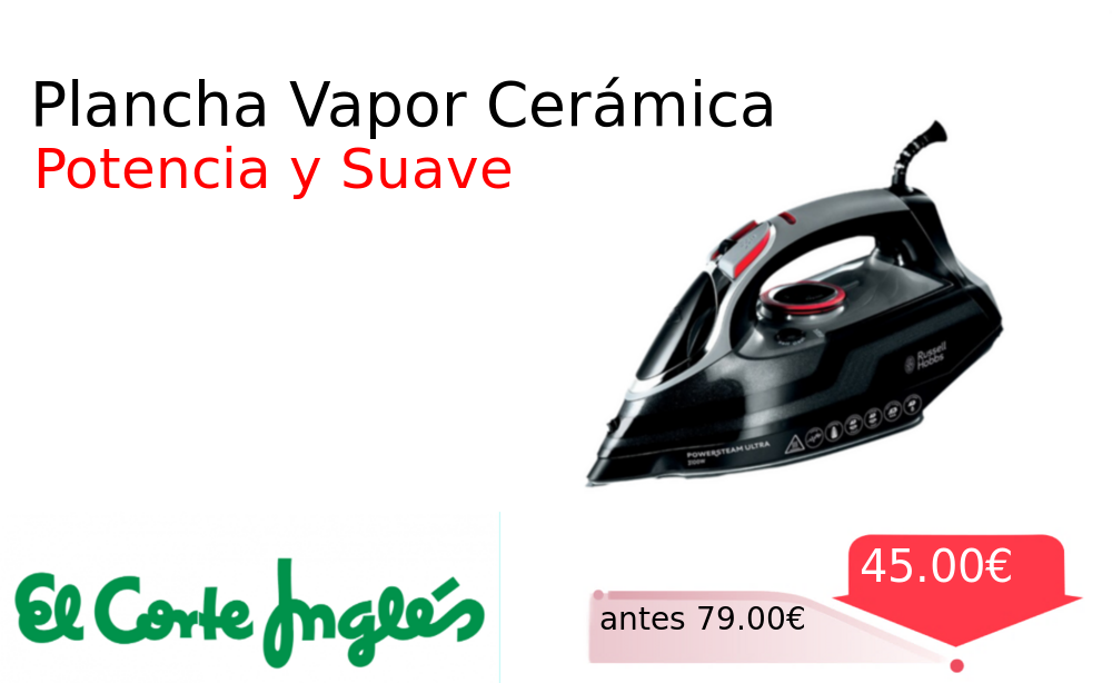 40% 📉 Vaya descuentazo‼‼ Plancha Vapor Cerámica❗️🆕 #Elcorteingles 📛Precio Ya 45.00€❗️ (PVP: +79.00€) ✨Plancha de vapor con suela cerámica que garantiza resultados profesionales Tecnología Power Steam Ultra para un planchado rápido y eficiente en cada uso. cholloya.com/RUSSELL_POWERST